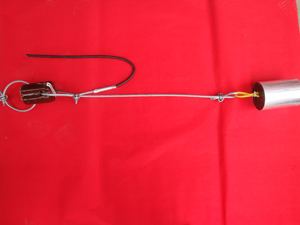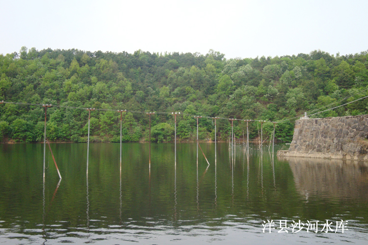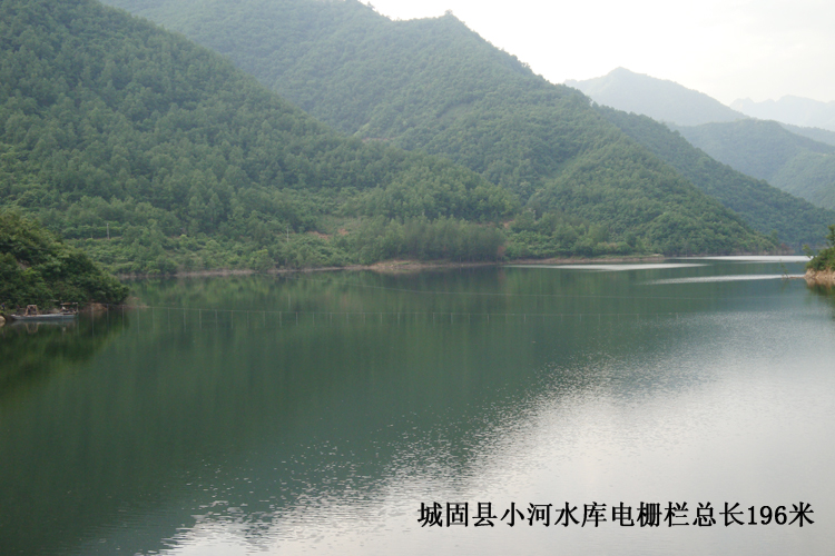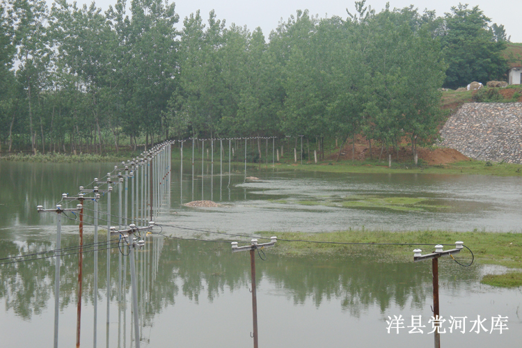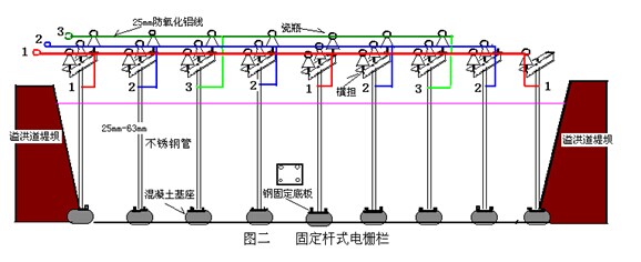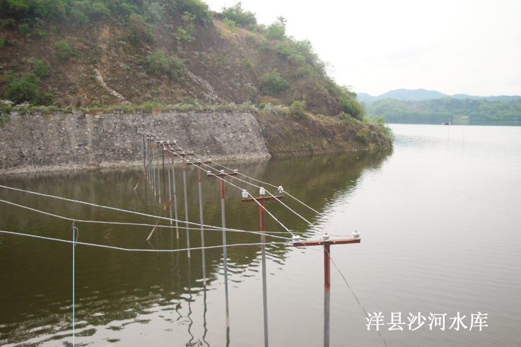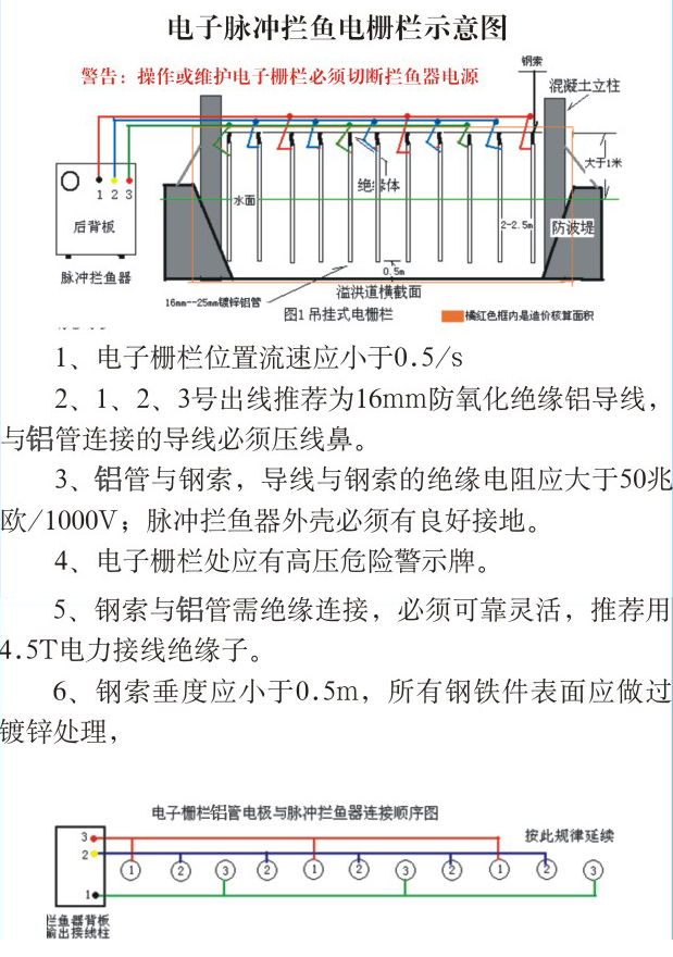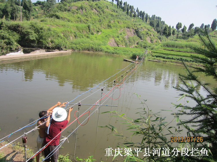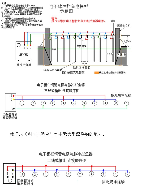 (二)電柵欄選址 選址原則的順序 流速---安全---方便施工---供電便捷。 1、 流速—流速的選擇,主要考量的是魚受到脈沖電流刺激后,能調(diào)頭回游的最快水流速度,電柵欄應(yīng)設(shè)置在水的流速小于1.5m/s(如水庫(kù)、池塘的溢洪道口)關(guān)口。 2、 安全—雖然設(shè)備產(chǎn)生的脈沖電流不足以危及人畜的生命,但不排除人畜原本是在帶病狀態(tài)下的危險(xiǎn),因此設(shè)置‘電柵欄’位置時(shí)應(yīng)盡量避開人畜經(jīng)�;顒�(dòng)的場(chǎng)所。 3、 方便施工—‘電柵欄’需用水泥樁,鋼絲繩來(lái)固定,選址應(yīng)考慮到結(jié)實(shí)牢靠,固定方便。 (三)電柵欄選型 攔漁‘電柵欄’有栽桿和吊桿兩種方式,吊桿式攔漁效率比栽桿式高26%,且施工方便,因此一般情況下應(yīng)優(yōu)先選擇。 按下圖建設(shè)電柵欄。 吊桿式(圖一)適合與水中有大型漂浮物,或不易建固定桿的水域。