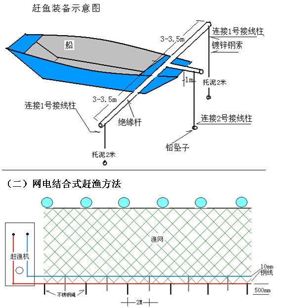 1、應(yīng)預(yù)先考慮到洪峰水面,鋼索、或不銹鋼管上安裝的橫擔(dān)、線路應(yīng)保持距離水面1米以上。 2、輸出連線應(yīng)首選優(yōu)質(zhì)鋁防氧化線,截面積≥25m㎡、絕緣耐壓等級(jí)≥1000V;線端壓接鋁質(zhì)線鼻,與不銹鋼管電極連接部位用大于6mm的螺栓壓緊。所有金屬器件表面必須經(jīng)過(guò)防銹處理。 3、安裝應(yīng)在專業(yè)電工的指導(dǎo)下進(jìn)行,安裝完畢需做金屬固定件與入水電極間的絕緣電阻測(cè)試,其阻值應(yīng)大于50兆歐/1000V;不銹鋼電極入水后1、2、3互相間的阻值應(yīng)在0.5---300歐姆范圍內(nèi);主機(jī)至入水電極的導(dǎo)線電阻應(yīng)<0.3歐姆。 二、合閘前準(zhǔn)備 1、先將主機(jī)左路、右路開關(guān)板到關(guān)OFF位,趕,攔旋鈕板到“攔”漁位,頻調(diào)旋鈕調(diào)至最小位,總電源開關(guān)放在ON位。 2、設(shè)置 A、設(shè)置電壓檔位: 水深<10米,攔寬<40米。選擇‘低(低功率)’檔,反之選擇‘高(高功率)’檔。 B、設(shè)置頻率檔位: 頻率調(diào)整范圍按10級(jí)劃分,逃漁量大或設(shè)備用作趕漁時(shí),頻率在5-10之間調(diào)整,反之則在1-5之間調(diào)整。 三、開 機(jī) 1、合上閘刀,首先打開主機(jī)面板上的總電源開關(guān)至ON位,可見電源指示燈亮,電壓表指示正常。 2、‘右路/左路’開關(guān)置于高位或低位(同時(shí)打到大時(shí)為高功率輸出,反之為低功率輸出)此時(shí)雙綠燈閃亮,同時(shí)能聽到機(jī)器有節(jié)奏的噠噠聲,說(shuō)明工作正常。 四、驗(yàn) 證 把頻率及電壓檔放到最小位,人的腳站在一個(gè)與周圍物體絕緣的地方,雙掌合十放在電柵欄鋼管電極中間的水中,然后慢慢分開,當(dāng)兩手掌距離超過(guò)25厘米時(shí),能感覺到明顯的電脈沖刺激且隨著兩手距離增加,刺激感覺增加,說(shuō)明設(shè)備正常。 關(guān)機(jī)的程序跟開機(jī)程序相反,須按順序操作。 五、關(guān) 機(jī) 關(guān)機(jī)的程序跟開機(jī)程序相反,須按順序操作。 1、 趕 漁 趕漁方法選擇 1、船上吊索式 適用與水深大于20米,庫(kù)塘底部大幅度凹凸不平,有巨石、樹木大型障礙物。這種方式趕漁速度較慢。 2、網(wǎng)電結(jié)合式 水深小于20米,庫(kù)塘底部較為平坦且無(wú)大型障礙。這種方式趕漁速度快,對(duì)難捕撈的鯉魚、鯰魚、清塘有良好的捕撈效果。 (一)吊索式趕漁方法: 1、準(zhǔn)備一臺(tái)交流220V,功率大于2.5kw發(fā)電機(jī)一臺(tái)。如(圖3、4)所示,船上加裝木桿(竹竿等絕緣良好的材料)及導(dǎo)線,水下導(dǎo)線(電極)可用鍍鋅鋼索或鋁導(dǎo)線去皮后垂入水中,在下端裝上適量的鐵塊做墜子。這樣船在進(jìn)行中導(dǎo)線不會(huì)浮起,電極長(zhǎng)度視水深而定,接線方式可根據(jù)實(shí)際采用圖3或圖4選擇效果好的一種接法。 2、按‘開機(jī)程序4’調(diào)好機(jī)器,將攔、趕漁開關(guān)扳到趕魚位。 3、檢查接線無(wú)誤后,電源箱開關(guān)板到開(ON)位。各種指示應(yīng)該一切正常。即可進(jìn)行趕漁作業(yè)。 4、若設(shè)備出現(xiàn)警告聲,面板紅燈亮證明水下電極相碰短路。 處理辦法:關(guān)閉設(shè)備電源分開水下電極,或調(diào)整電極長(zhǎng)度至合適。 5、趕漁時(shí)船應(yīng)“之”字行進(jìn),每趕完一個(gè)區(qū)域,即時(shí)下網(wǎng)截住,防止魚群回游,兩張網(wǎng)輪換截魚便可實(shí)現(xiàn)趕漁目的。