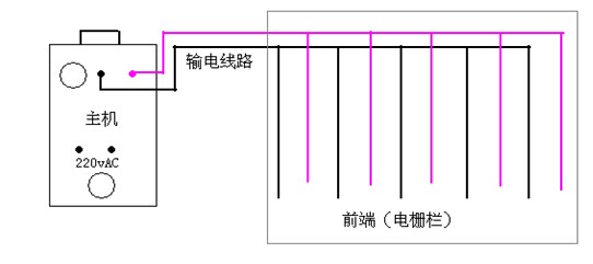 1、攔 漁 (一)系統(tǒng)組成 如下圖:整套系統(tǒng)有攔漁主機(jī)---饋電線路---前端設(shè)備(電柵欄)三部分構(gòu)成,主機(jī)產(chǎn)生高壓脈沖電流,由導(dǎo)線送至電柵欄,電柵欄按一定規(guī)律排列,把脈沖電流均勻釋放到攔截水域。